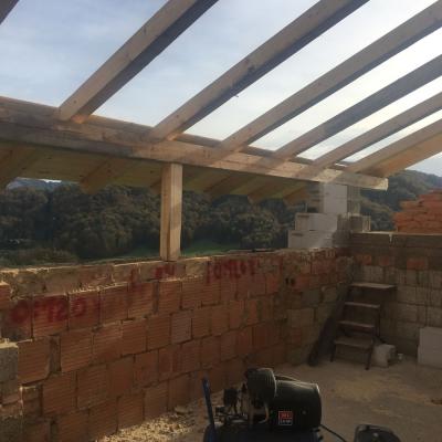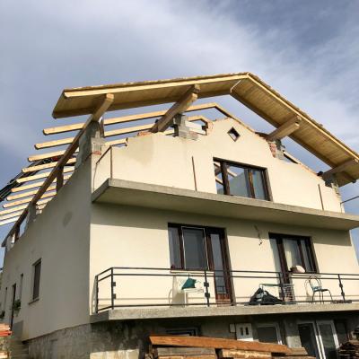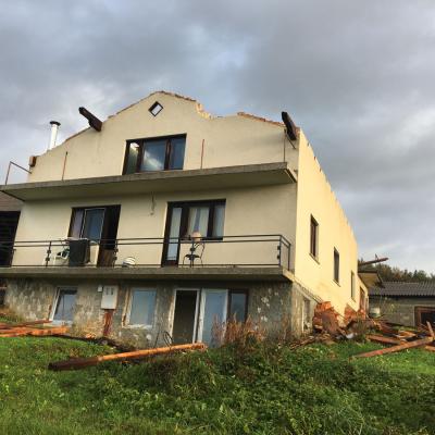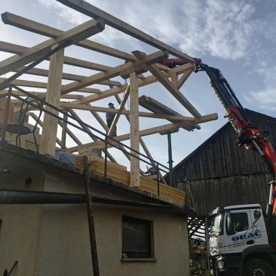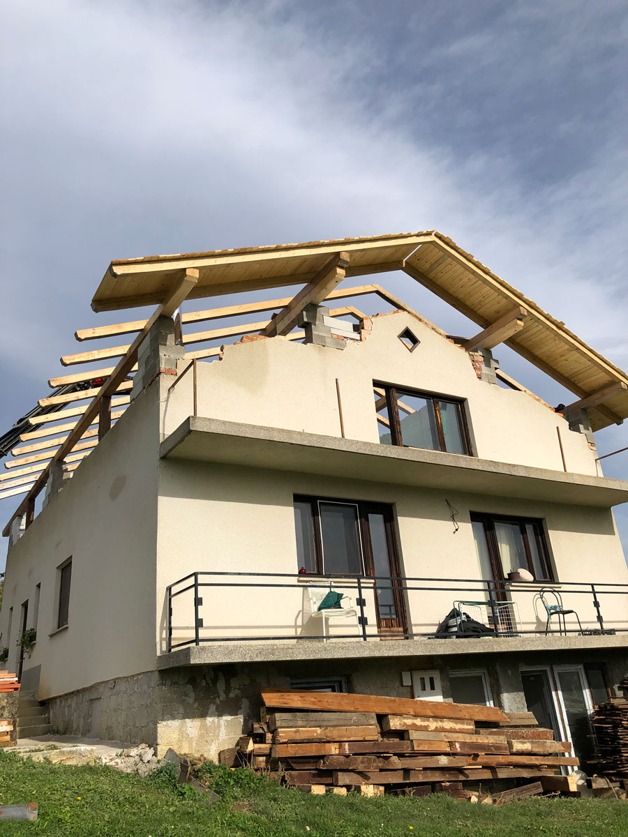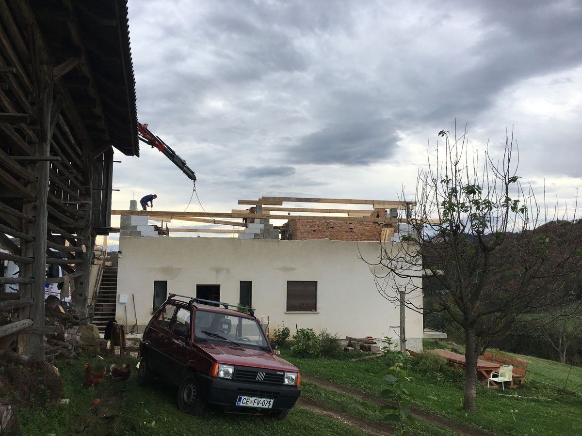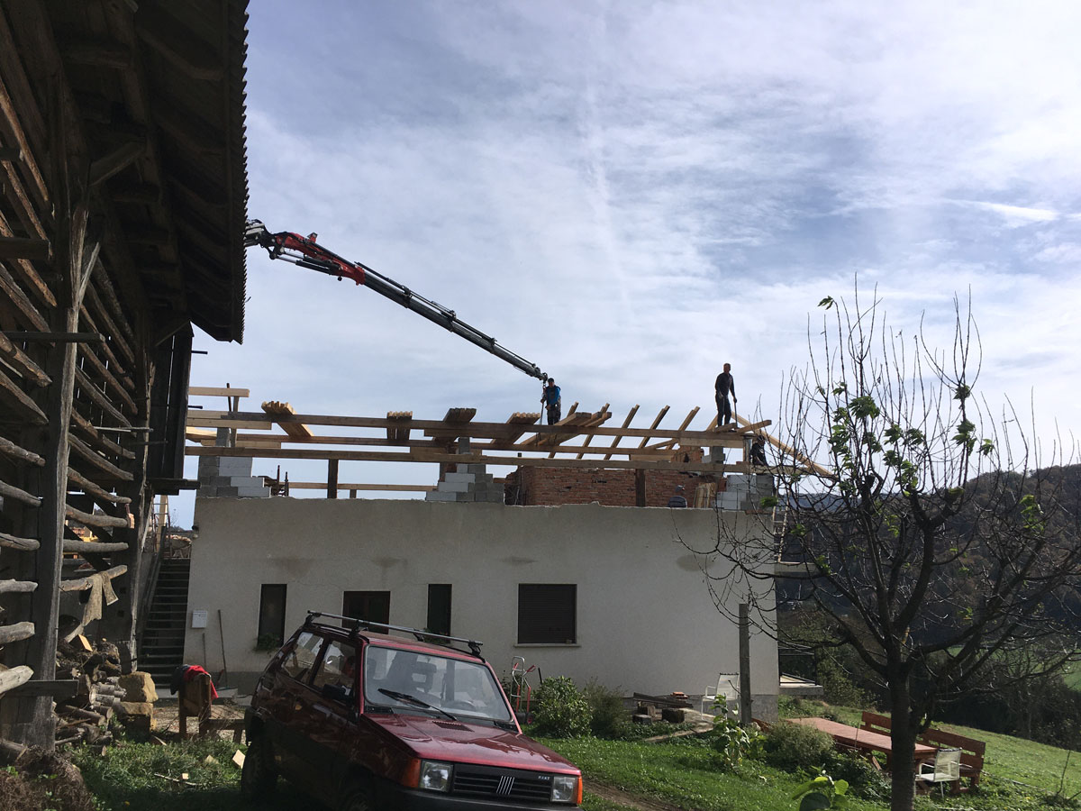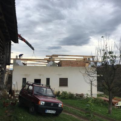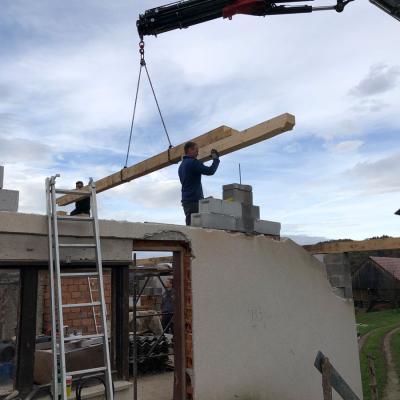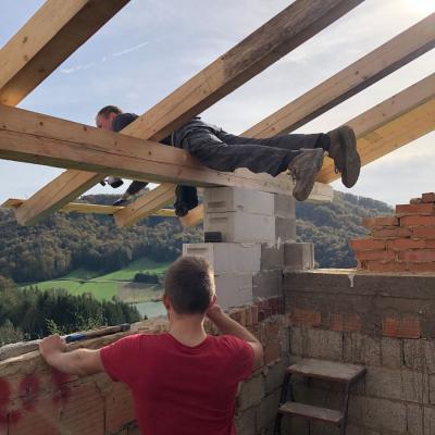 Die Tage Ende Oktober 2023 bleiben uns in besonderer Erinnerung. Am 27. Oktober wurde der durch Hagel beschädigte alte Dachstuhl abgerissen. Am nächsten Morgen hat es so heftig geregnet, dass viel Wasser ins Haus gelaufen ist. Und am 30. Oktober hat das Haus in nur einem Tag einen neuen Dachstuhl bekommen.